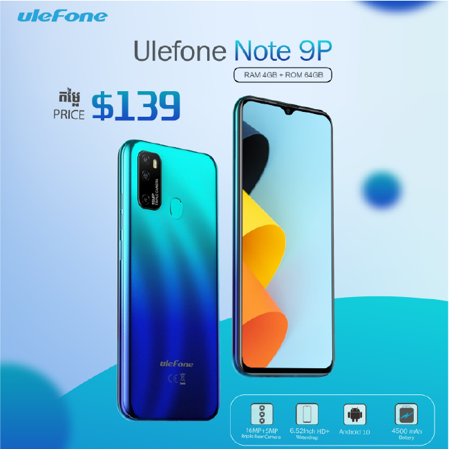 Ulefone Note 9P .អង្គផ្ទុកទិន្នន័យ៖ 4GB RAM + 64GB ROM .កាមេរ៉ា៖ 16MP + 5MP Macro Lens + 2MP ជាមួយកាមេរ៉ាមុខ 8MP .ប្រព័ន្ធប្រតិបត្តិការ៖ Android 10 .ថាមពលថ្ម 4500mAh .អេក្រង់ 6.52Inch HD+ .ការដោ...