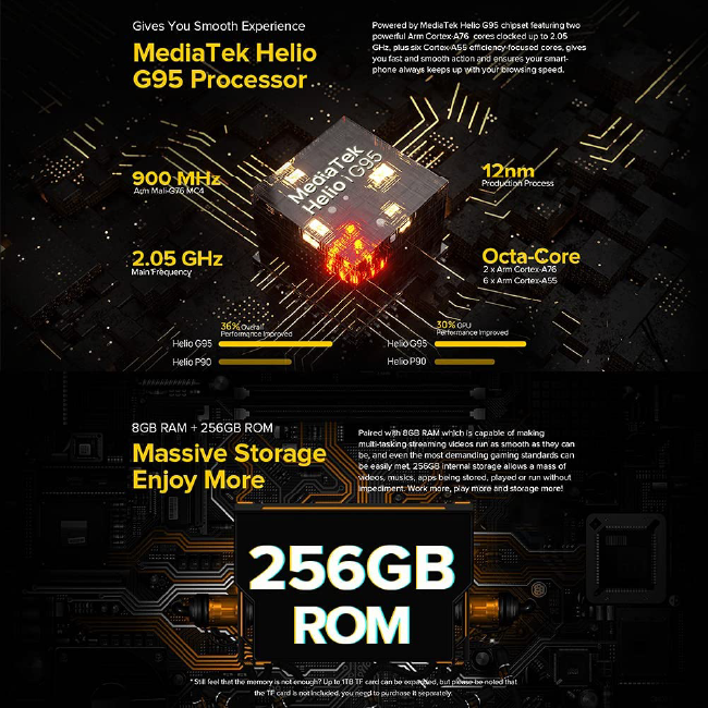 | Chipset | Mediatek Helio G95 (12 nm) |