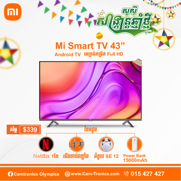 Mi Smart TV 43" អេក្រង់កំរិត FHD អាចទស្សនា Youtube ដល់កម្រិត FHD មាន App អាចមើលរឿងHollywoodថ្មីៗ Bluetooth & Wifi Google Play Store & Chromecast Built-in Google A...