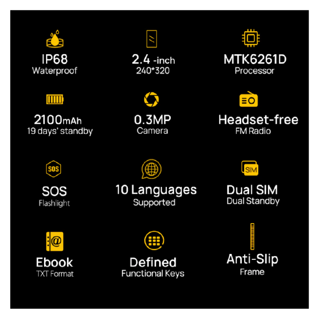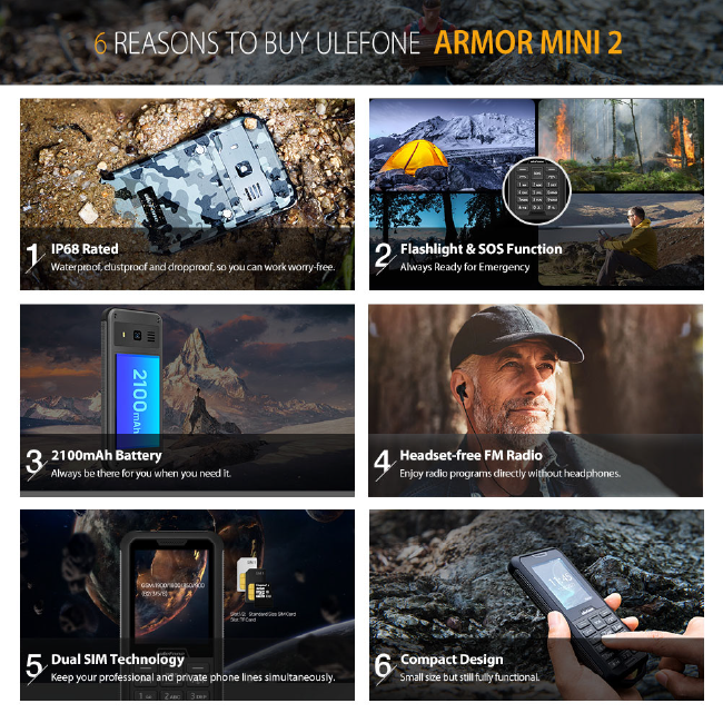 Ulefone Armor Mini2 ទូរស័ព្ទមិនជ្រាបទឹក IP68 មិនជ្រាបទឹក ធន់នឹងធូលី ដូច្នេះអ្នកអាចធ្វើការដោយគ្មានកង្វល់។ ភ្លើងពិល និង មុខងារ SOS ដែលមានភាពងាយស្រួលក្នុងការប្រកាសអាសន្ន កម្លាំថ្ម 2100 mAh ប្រ...