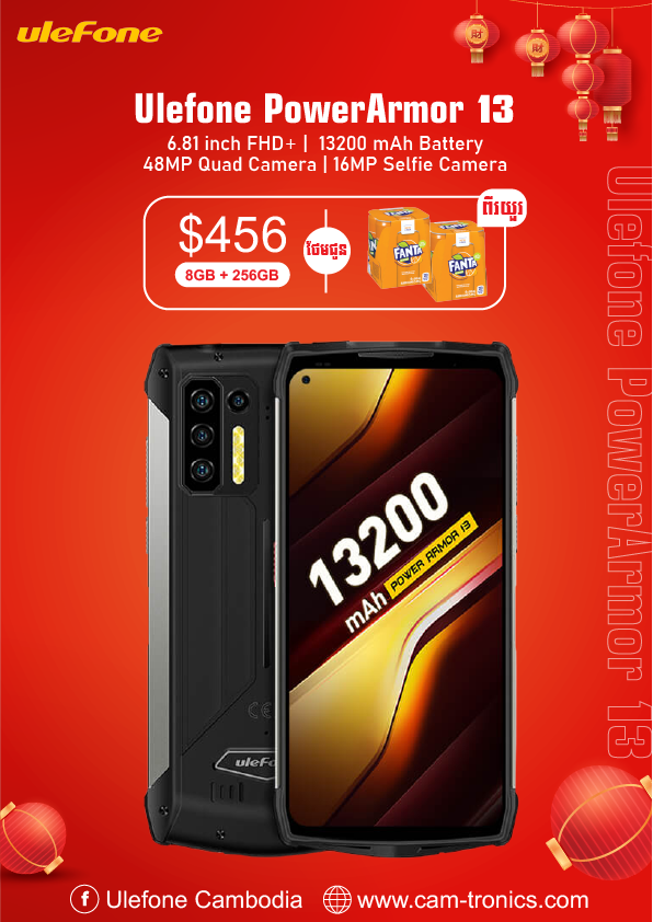 Ulefone Power Armor 13 .ថាមពលថ្មធំ 13200mAh .អេក្រង់ 6.81inch Full HD+ .48MP Quad Camera,16MP Front Camera .បំពាក់បន្ទះឈីបMediaTek Helio G95 .Ram8GB + Rom256GB .Android 11 .សាកថ្មលឿន 33W .IP68...